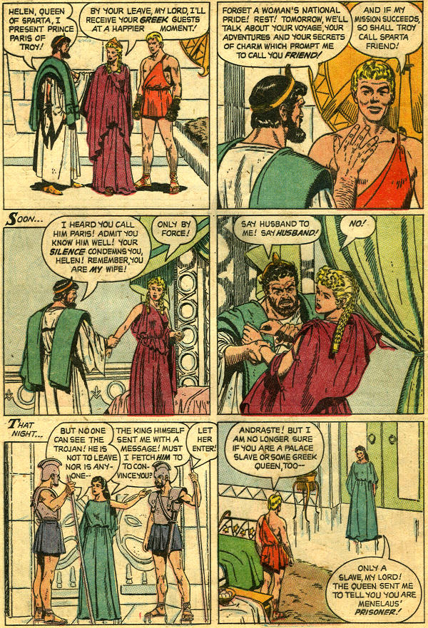 John Buscema was the artist who drew Dell's adaptation of Helen Of Troy, but I didn't know that until quite a while after Buscema's art became familiar to me in the late '60s-early '70s. By that later stage of his career Buscema was fully immersed in the Marvel Comics style, drawing super-heroes like The Avengers and sword-and-sorcery like Conan. His art was full of action, Jack Kirby-style. By comparison, Helen Of Troy (published as Dell Four Color #684, and dated March, 1956) was more sedate and illustrative, more Hal Foster's Prince Valiant than Jack Kirby. Not that he didn't draw some action in Helen. The fight scenes are very good. Buscema's art is solid and well-suited to the material.