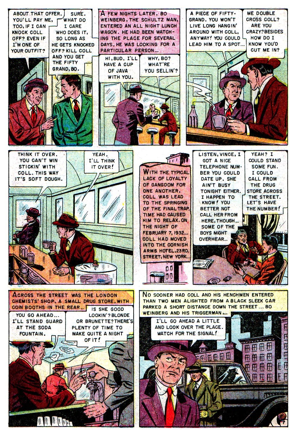 Sometimes the monsters that temporarily roam this planet aren't summoned from fiery bottomless pits, or created in shadowy cold laboratories. "Mad-Dog" Vincent Coll was a TRUE horror story, a brutal Irish mob hitman in early 20th-century New York City who gained notoriety for the accidental killing of a young child during a mob kidnap attempt. His short and violent life has been examined in popular movies and tv shows (check the wikipedia link above for more info on this too) as well as in this nicely done back-up feature from Avon Comics' 1951 one-shot issue of Hooded Menace #1. It's not a "horror" story of course, but does contain some supremely bloody, and horrifying moments... and it's another good example of the 'ol ultra violence displayed in pre-code crime comics.