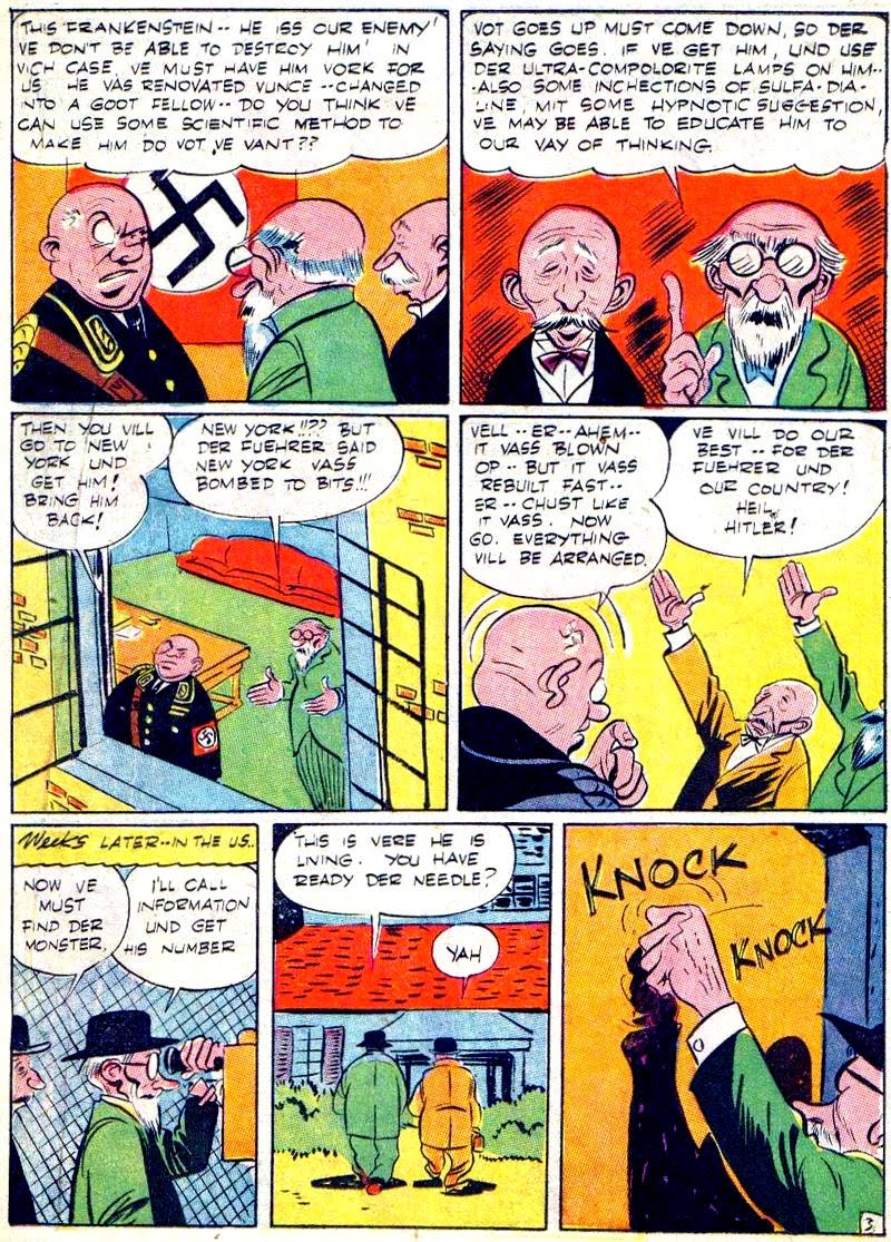Dick Briefer is one of the great comic book men, whose career was most active during the 1940s. Here's a Frankenstein story by him from Prize Comics #39, 1944, where Frankenstein becomes a member of the Gestapo! (This story is not taken from Craig's book.)