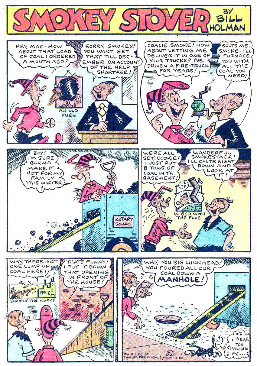 Dell's Super Comics #118 (1949) published 24 pages of 1945 Smokey Stover and Spooky Sunday strips by the inimitable Bill Holman. I'm passing along the favor by re-presenting them to you.