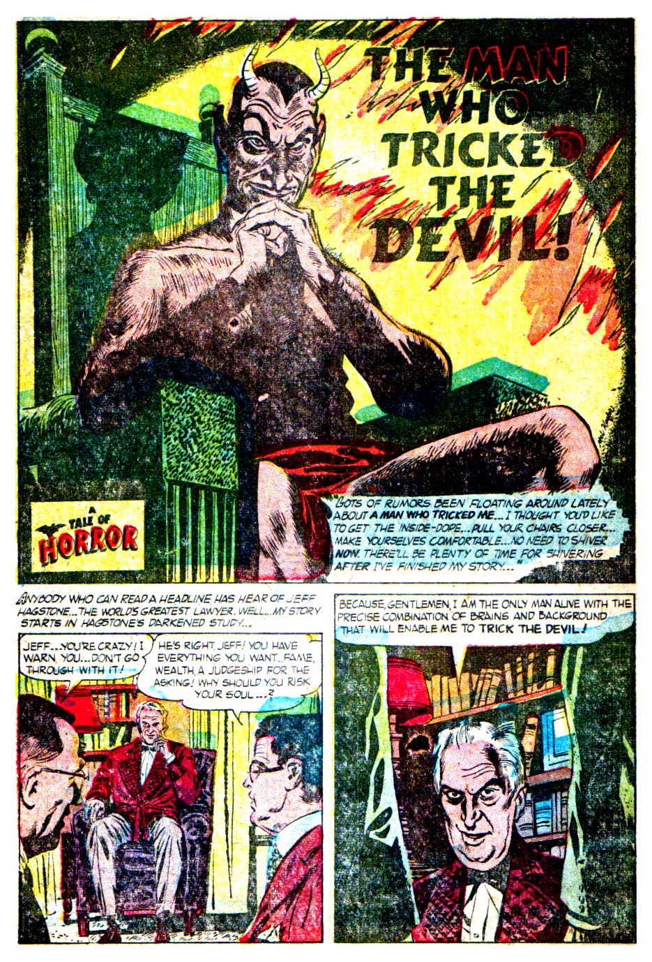 Today we have the last story (thank the lard) from Tales of Horror #7 1952, aka the crummiest comic book in my collection... NOTE: when I say "crummy" I'm talkin' about a multitude of things like the print failure! every page loose! zero spine! fallin' apart / brittle condition! -- I certainly have nothing against the art or stories. So for you issue completists, also see: "Dinky!", "Die for the Beggar", and the really great "Beast from the Deep!" that we posted waaay back deep in the 2008 THOIA Archives!