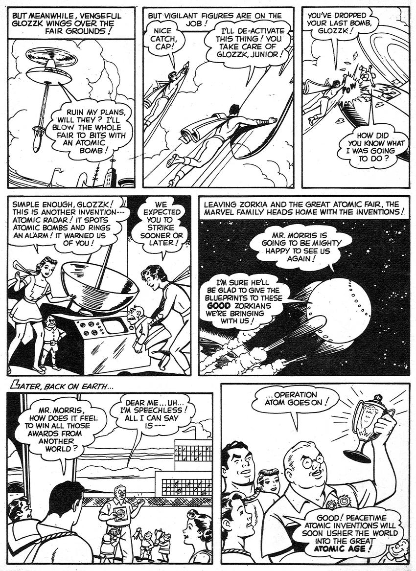 The Marvel Family comics, particular favorites of mine, look to me as if scripter Otto Binder had fun with the writing, and Beck and his assistants had fun with the artwork. The pro-nuke stuff is fairly typical fifties puff that atomic energy would change our lives with such things as “atomic trucks.” Imagine an atomic truck hurtling down the freeway, right on your back bumper.