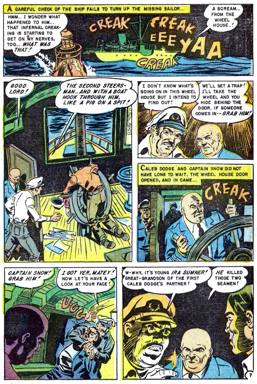“Curse of the Sea Witch” is from Dark Mysteries #1 (1951). Art identifier extraordinaire Jim Vadeboncouer, Jr says that Joe Orlando and Wood collaborated on the cover, and qualifies his opinion on who did the art on the story by listing it as by “Wood and ?” I agree with Jim, and I think other hands worked on the story with Wood, but he did a substantial amount of it, enough to give it that “Wood-veneer.” The story for “Sea Witch” is credited to Arthur Framson. Checking Jerry Bails’ Who’s Who I see that Framson is credited with only a couple of comics in the same period, so it could have been a pen-name, or he just had a really brief career in comic books.